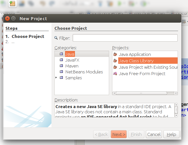 - If you are creating a new project from scratch click on “New Project” icon and then select Java -> Java Class Library