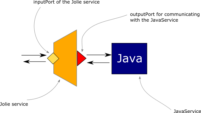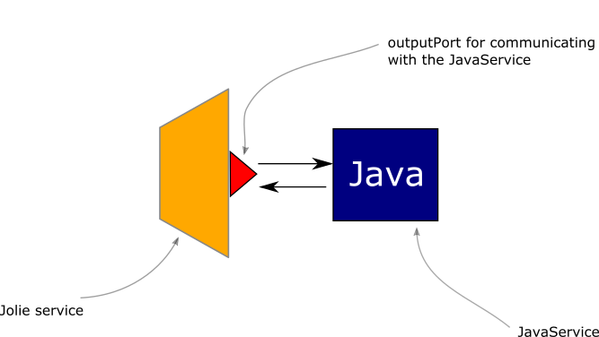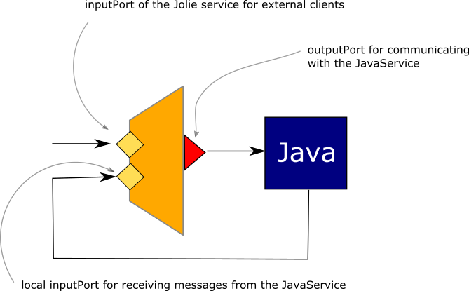 As it is possible to note, here the Jolie service communicates with the JavaService with a synchronous call equivalent to a RequestResponse.